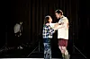 Spelerommet er altså ganske opent. Ingen rekvisittar, ingen grus eller malingssliten benk på denne kyrkjegarden. Dette gjer at arbeidet til skodespelarane kjem særs tydeleg fram. Mann (Conrad James McLean) og Kvinne (Johanna Mørck) møter kvarandre. Fosses tekst har så mykje musikk og rytme i seg (alle skodespelarar snakkar om dette), men han må musiserast med. Her blir det ikkje heilt rytmisk godt. Det blir ikkje heilt nokon god flyt, det blir litt urytmisk og tørt. Den som sym fritt og godt i denne Fosse-teksten er Kjersti Sandal som speler Mor. Ho leiker virtuost med teksten, her er det fin flyt. Det er ein fryd å sjå og høyre. Ho speler Mor på ein heilt annan måte enn Ågot Senstad som hadde rolla i Nationalteatret sin versjon der ho var strålande. Senstad var stikkande og anklagande. Det er ikkje Sandal. Ho er i fantastisk godt humør, sprudlande, sjølv om teksten stikk og stikk. Det kjem nok av at dette er ein mykje meir teatral versjon.